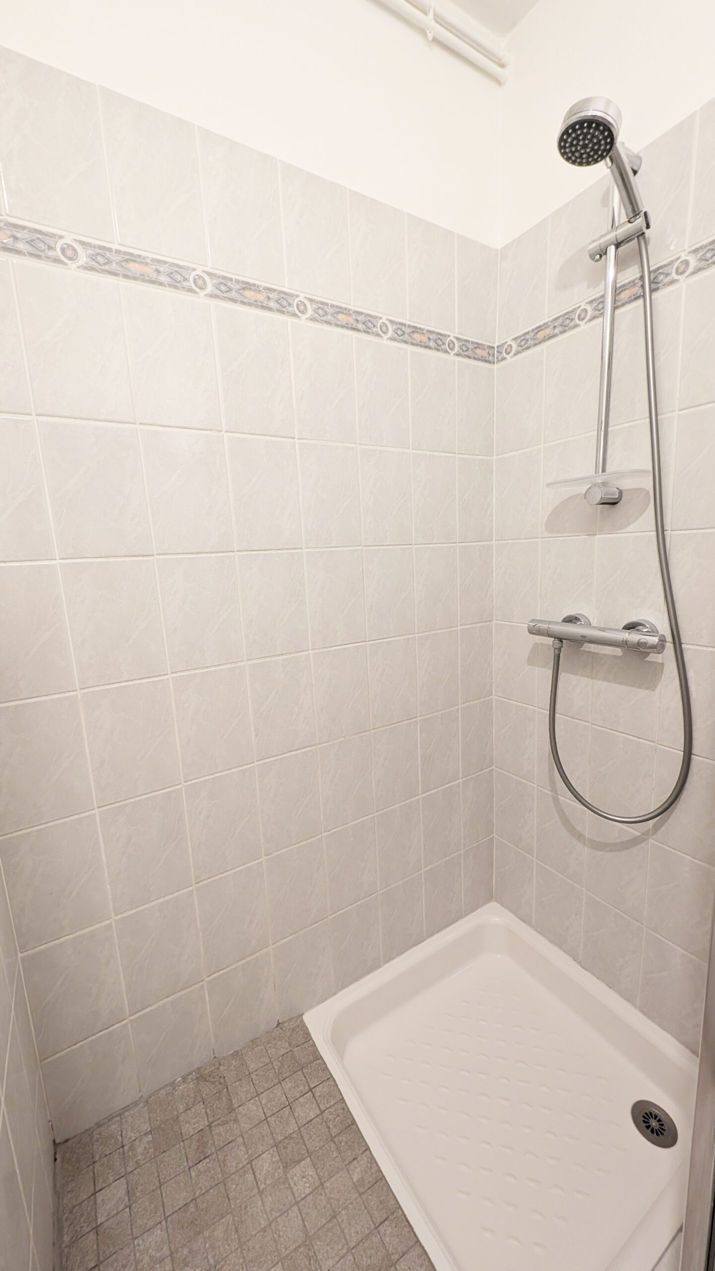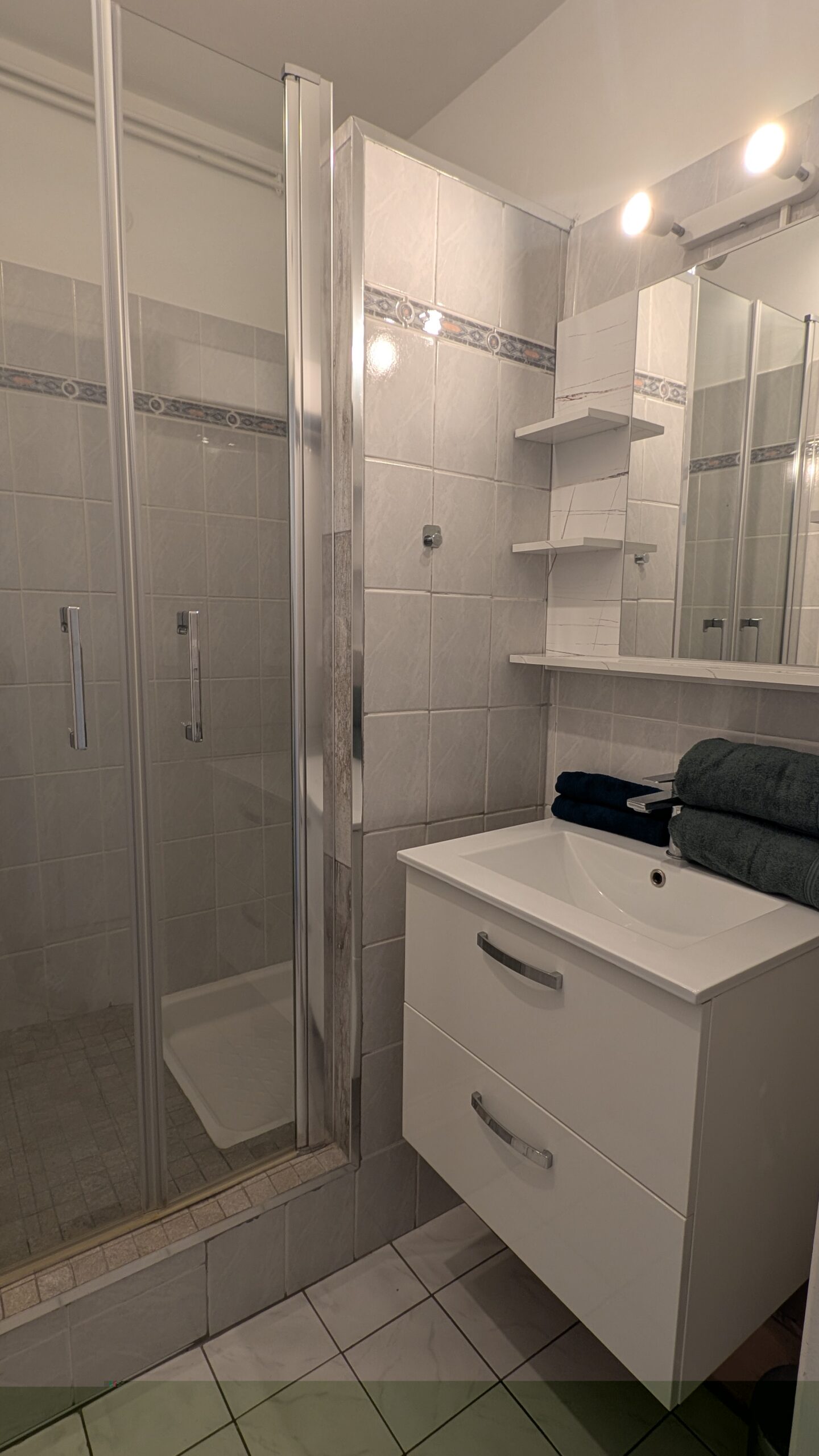 En entrant à droite se trouvent 2 placards et à gauche les toilettes, puis la salle d’eau (douche).
