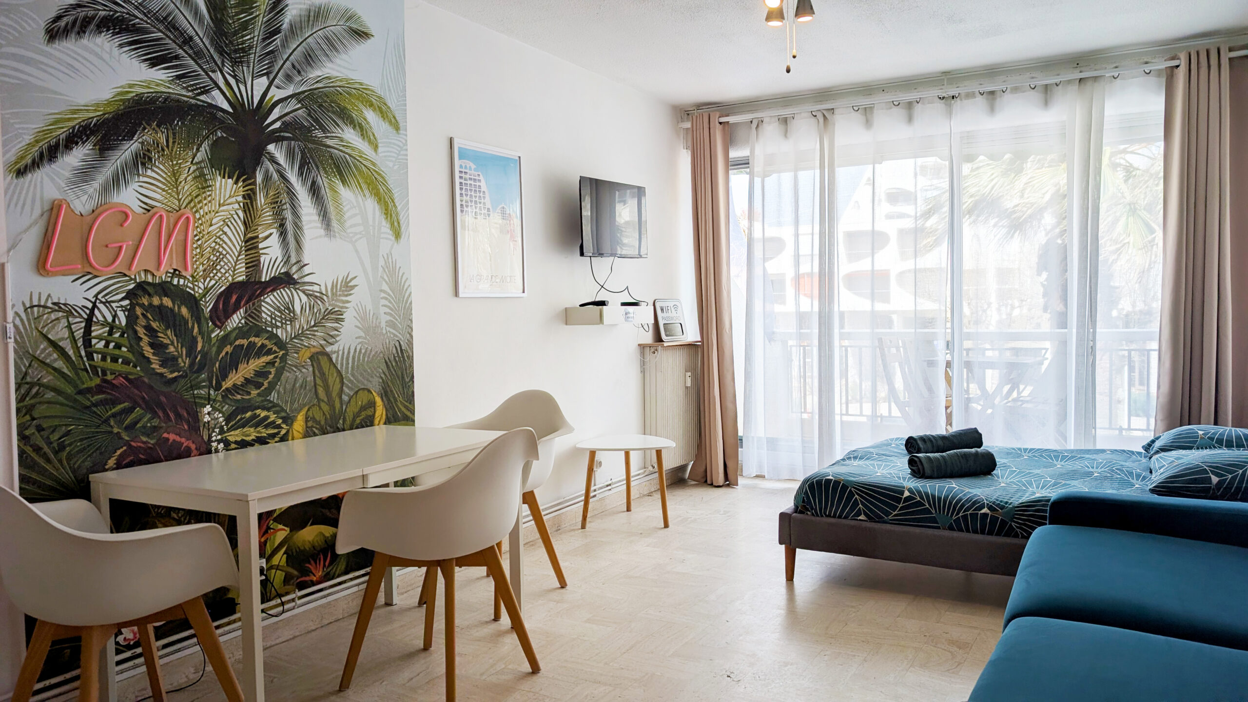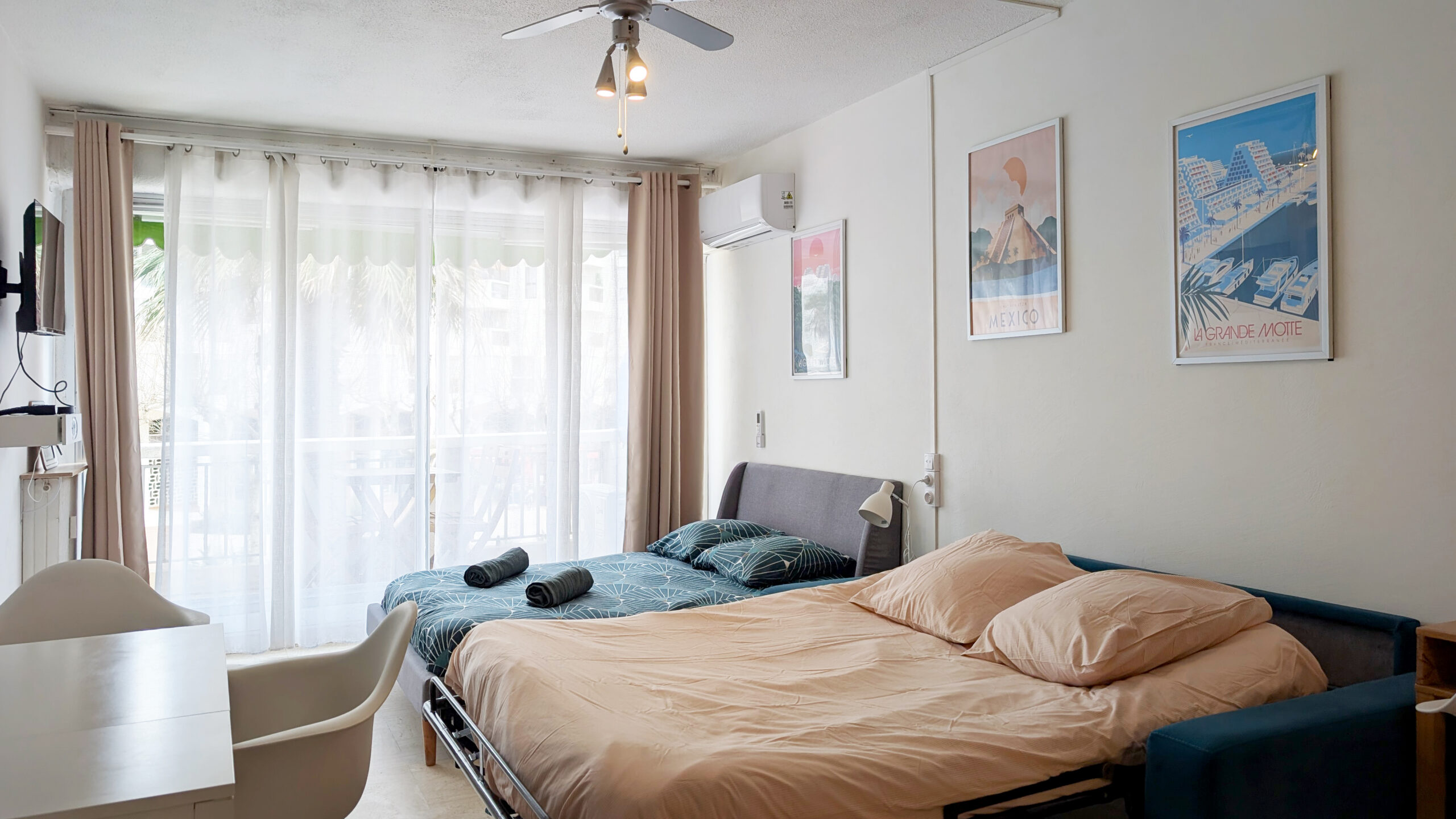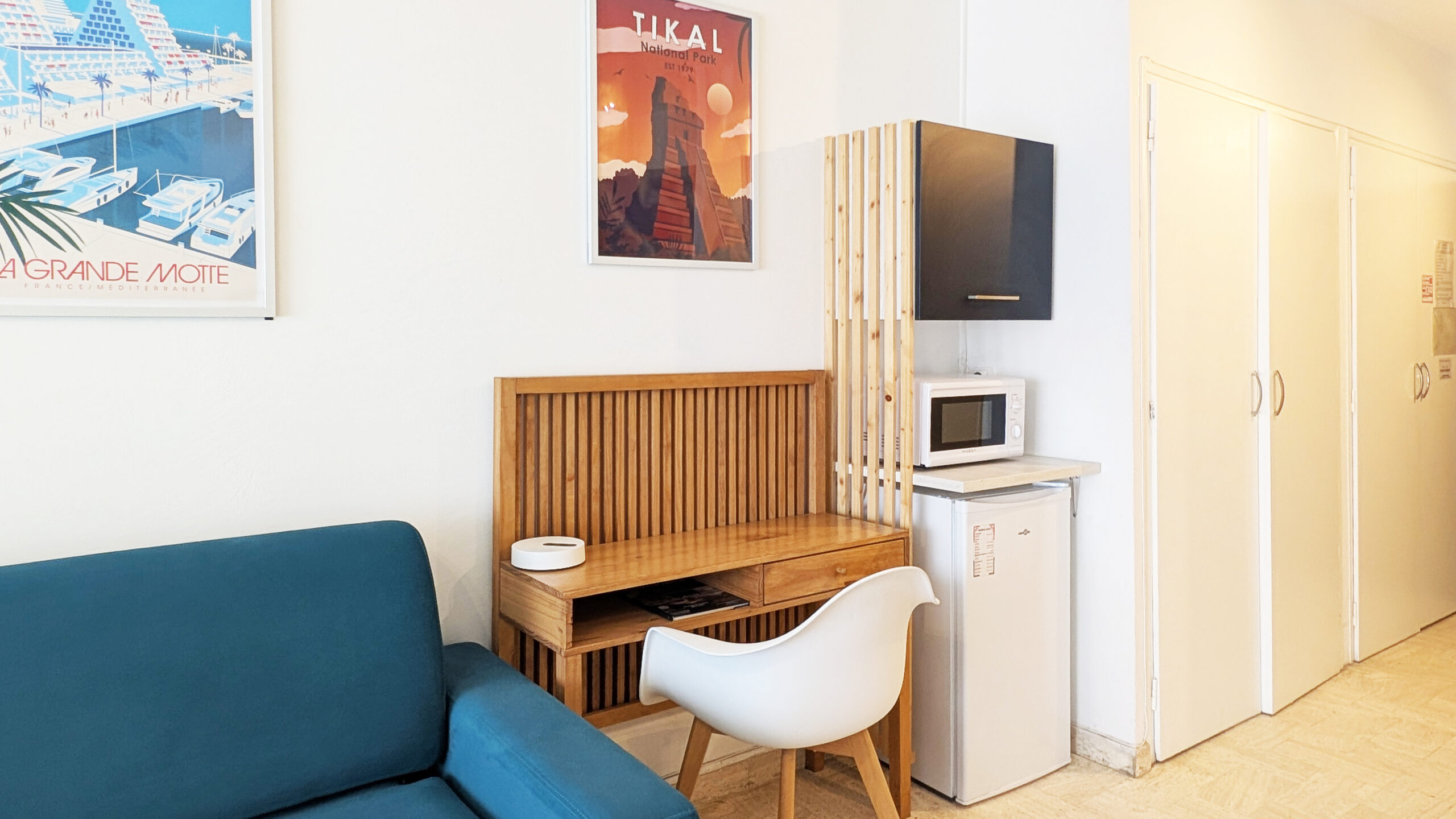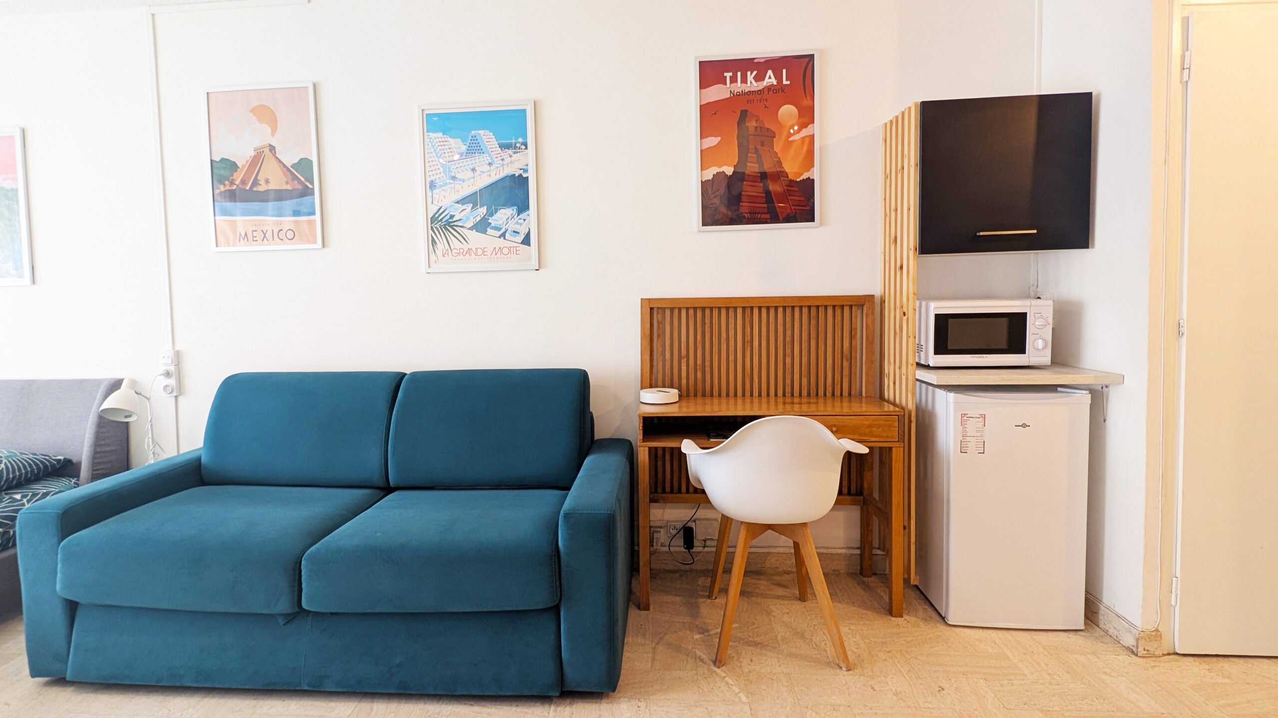 Dans le salon, sur votre gauche, se trouvent le coin cuisine (machine à café SENSEO), la table, puis la télévision. Sur votre droite, un réfrigérateur, un bureau, un canapé-lit à ouverture expresse et un vrai lit.